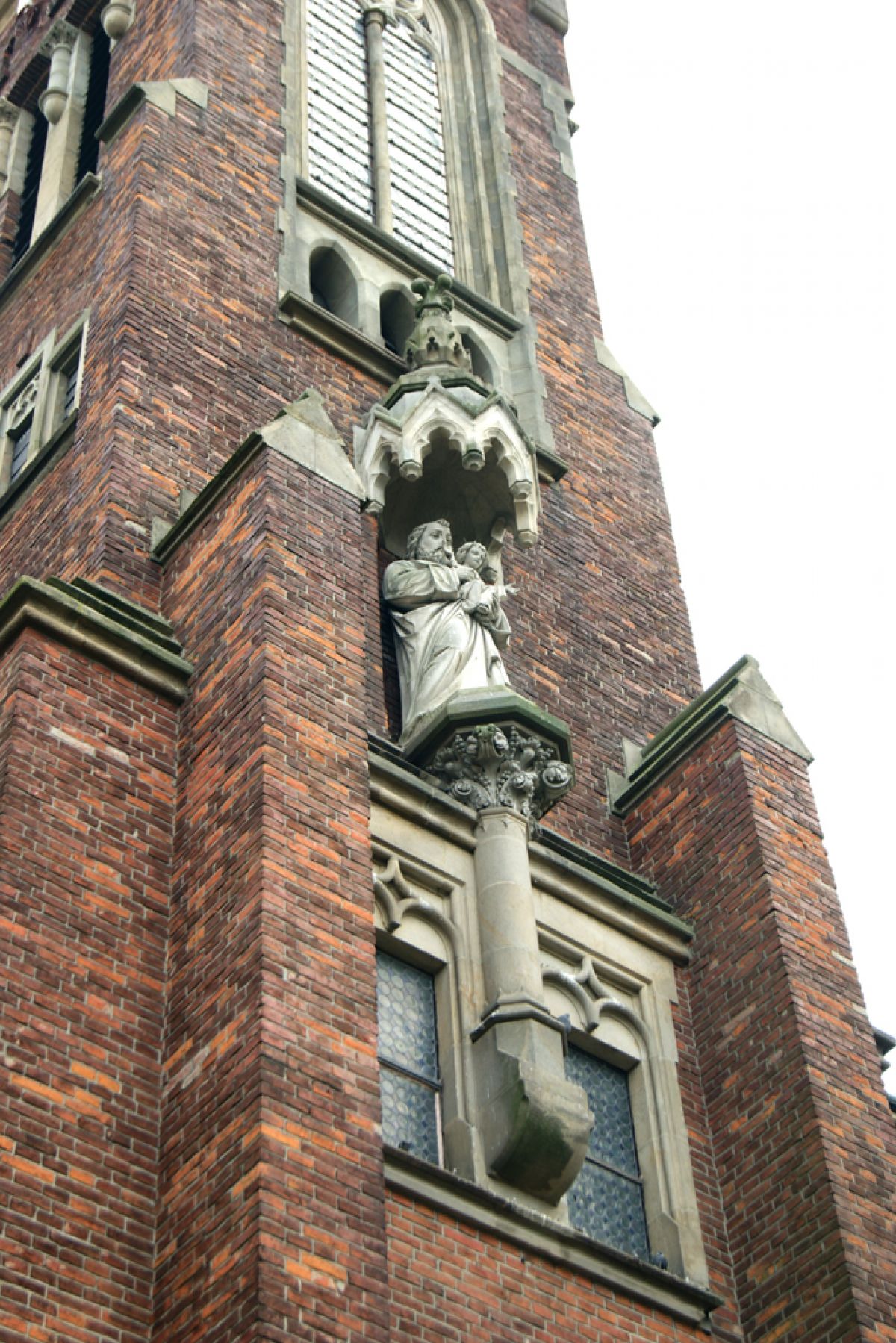 Figura jest wykonana z kamienia, wnęka zakończona ozdobną kopułą. Z tej wysokości, jakby z wysokiego tronu, Patron parafii spogląda na swoją dziedzinę i dostrzega każdego. I tak pełni swą opiekę już od wielu, wielu lat...