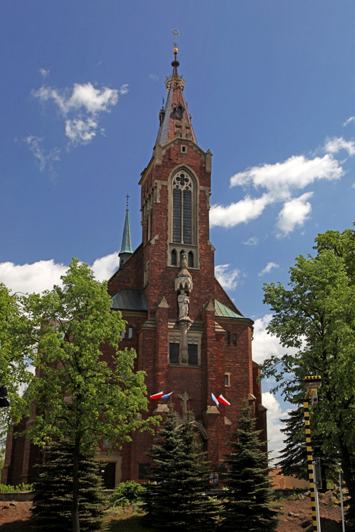 Kościół wzniesiony został na rzucie krzyża łacińskiego jako trójnawowy, trójprzęsłowy z transeptem o ramionach zakończonych prostokątnymi kaplicami. Prezbiterium dwuprzęsłowe zamknięte jest trójbocznie. Do prezbiterium przylegają prostokątne w planie: zakrystia od południa i składzik z przedsionkiem od północy. Od zachodu kruchta z dwoma mniejszymi przedsionkami po bokach. Kościół o zwartej, strzelistej bryle z dominującą nad korpusem wysoką trójkondygnacyjną wieżą. Korpus nawowy przykrywa wysoki dwuspadowy dach ze smukłą wieżyczką na sygnaturkę. Dwuspadowy, niższy dach przekrywa też transept. Nad prezbiterium dach trójspadowy. Elewacje z uskokowymi szkarpami, zwieńczone profilowanym gzymsem.