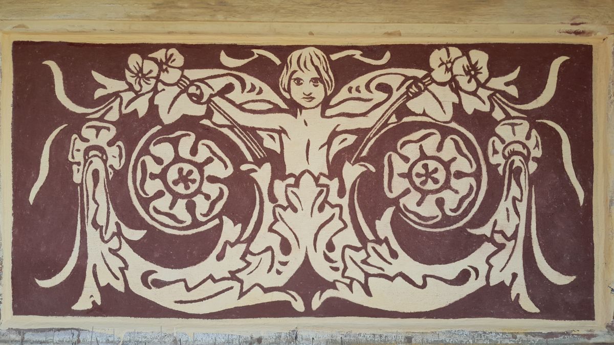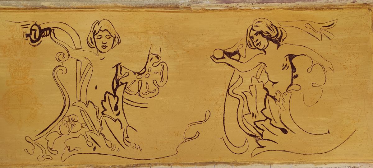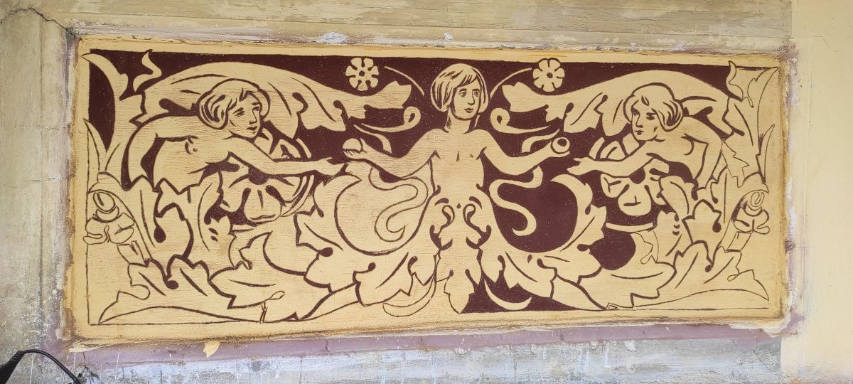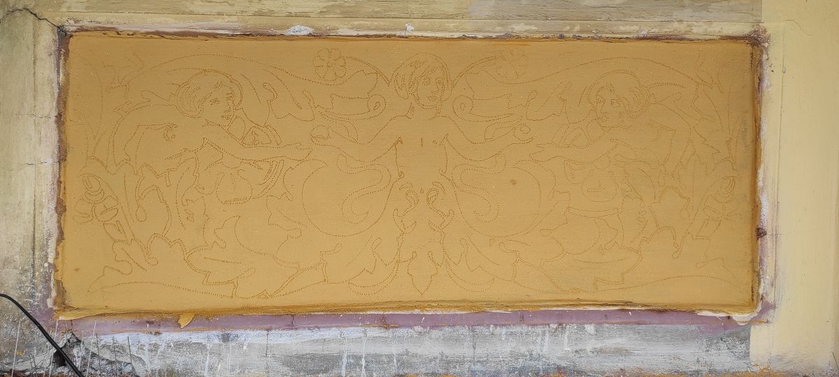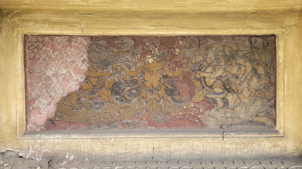 Do niedawna zły stan zachowania sgraffita uniemożliwiał jego prawidłowy odbiór, a nawet jego rozczytanie. Z uwagi na jego sczernienie i stopień destrukcji, powszechnie sądzono, iż zastosowany tam motyw dekoracyjny to arabeska. Dopiero podczas prac konserwatorskich realizowanych w 2022 r. okazało się, że zastosowane tam formy bliższe są grotesce, a w stylizowane wici roślinne wpisane są urocze scenki figuralne.