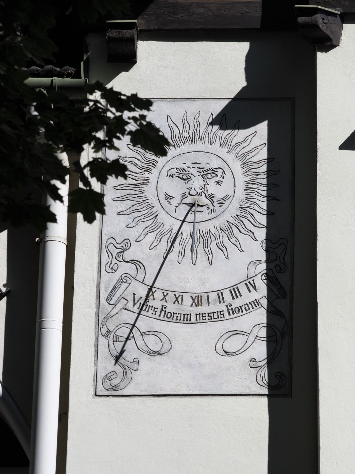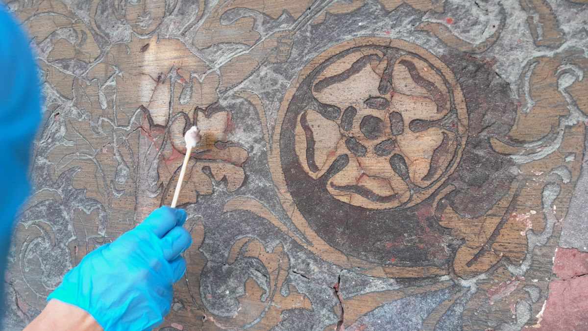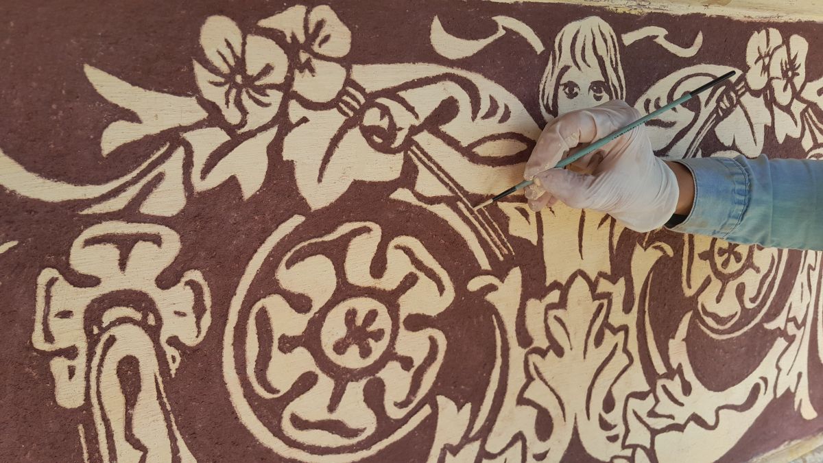 Do niedawna zły stan zachowania sgraffita uniemożliwiał jego prawidłowy odbiór, a nawet jego rozczytanie. Z uwagi na jego sczernienie i stopień destrukcji, powszechnie sądzono, iż zastosowany tam motyw dekoracyjny to arabeska. Dopiero podczas prac konserwatorskich realizowanych w 2022 r. okazało się, że zastosowane tam formy bliższe są grotesce, a w stylizowane wici roślinne wpisane są urocze scenki figuralne.