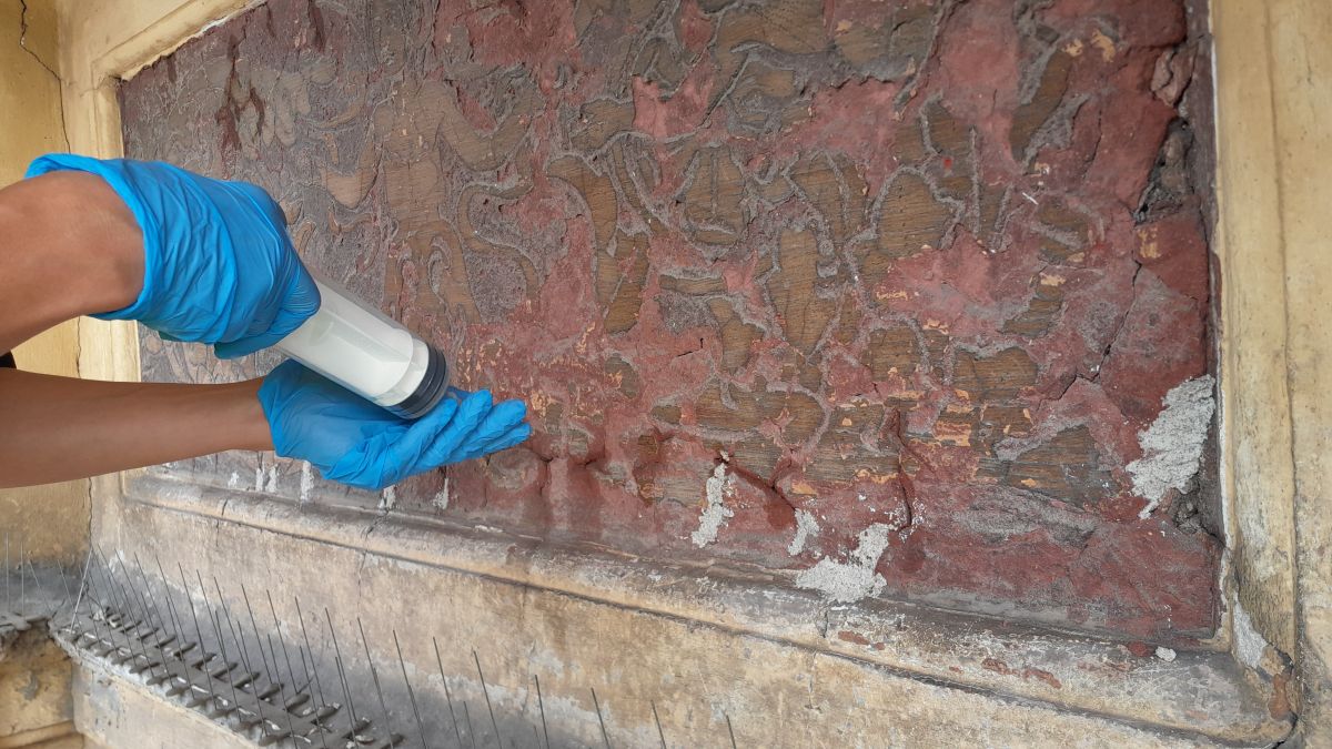 Rekonstrukcję niezachowanych partii sgraffita wykonano w oparciu o sprawdzoną historycznie tradycyjną technologię jego wykonywania. Wcześniej, konserwatorzy pobrali z oryginału próbki tynków oraz pobiały i poddali je badaniom fizyko-chemicznym pod kątem określenia składu jakościowego i ilościowego użytych materiałów oraz rozpoznania zastosowanej przez autorów sgraffita receptury. Wyniki badań przyniosły odpowiedź na pytanie, dlaczego stan sgraffita był katastrofalny i dlaczego doszło do tak rozległych jego zniszczeń. Okazało się, że jego autorzy zmodyfikowali tradycyjną recepturę, zapewne w celu usprawnienia i przyspieszenia sobie pracy, poprzez dodanie do zapraw gipsu. Gips, który jest materiałem higroskopijnym, nieodpornym na działanie czynników zewnętrznych, przyśpieszył proces degradacji, będąc głównym winowajcą zastanego stanu dekoracji. Po wstępnym oczyszczeniu mocno sczerniałych partii zachowanego oryginału, okazało się, że nie jest to dekoracja monochromatyczna, ale jest do sgraffito dwubarwne. Z badań próbek wynika, że do zabarwienia ciemnej, purpurowej warstwy został użyty miał ceglany, a słomkowy odcień pobiały wapiennej jest efektem dodania do niej ugru oraz ochry, tj. pigmentów o żółtawym, ciepłym zabarwieniu. Realizacja rekonstrukcji niezachowanych partii fryzu polegała na narzucaniu na ścianę zaprawy piaskowo-wapiennej zabarwionej w tonacji najbardziej zbliżonej do kolorystyki oryginalnego sgraffita, którą następnie wyrównywano, wygładzano i pokrywano kilkoma warstwami podbarwionej pobiały wapiennej. Po wstępnym stężeniu zaprawy, przykładano i dopasowywano odpowiednią kalkę z rysunkiem, który przenoszony był metodą „przepróchy” przy użyciu pigmentu sypkiego, wcieranego suchym pędzlem w dziurki, które uprzednio wykonane zostały na roboczych kalkach na liniach kompozycji. Następnie, naniesiony rysunek wyskrobywano odsłaniając spod pobiały barwioną zaprawę spodnią. Wykonując ryty, konserwatorzy dobrali narzędzia, które pozwoliły odzwierciedlić charakterystyczny dla oryginału efekt żłobienia.