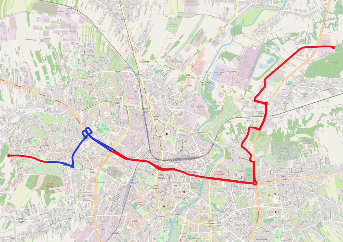 BŁOGOSŁAWIONEJ KAROLINY – Bł. Karoliny – German – Wyspiańskiego – Strzelnicza (wybrane kursy: Wywrockiego) – Plenerowa – Panoramiczna – al. Witosa – Wyspiańskiego – Wita Stwosza – Srebrna – Langiewicza – Boya-Żeleńskiego – Hanasiewicza - Chmaja – Langiewicza – Hoffmanowej – Mochnackiego – al. Cieplińskiego – Marszałkowska – Lubelska – Trembeckiego – Siemieńskiego – Żółkiewskiego – Batorego – Styki – Orzeszkowej – Batorego – Fredry – Głowackiego – al. Piłsudskiego – Lwowska – Olbrachta – OLBRACHTA PĘTLA