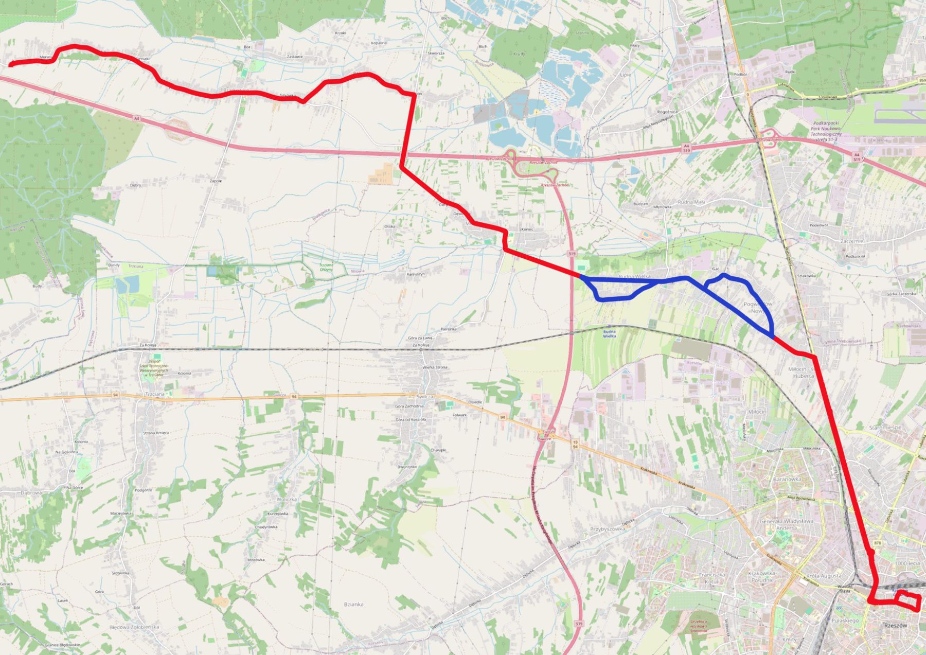 BŁĘKITNE WZGÓRZE / LEŚNE WZGÓRZE – Błękitne Wzgórze – KIELANÓWKA – RZESZÓW: Staroniwska – Langiewicza – Wita Stwosza – Wyspiańskiego – al. Witosa – Krakowska – al. Piłsudskiego – Targowa – Szopena – Podwisłocze – Kwiatkowskiego – Strażacka – Robotnicza – ŁUKASIEWICZA PĘTLA