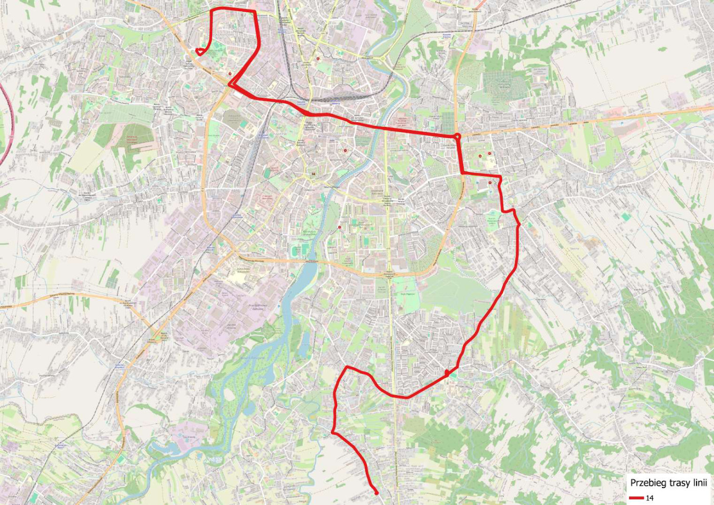 Rejtana – Paderewskiego – al. Krzyżanowskiego – al. Niepodległości – Mieszka I – Lwowska – Cienista – CIENISTA CMENTARZ) BIZNESOWA – Biznesowa – Technologiczna – Inwestycyjna – Chmury – Krakowska – al. Wyzwolenia – Lubelska – Marszałkowska – al. Cieplińskiego – al. Cieplińskiego – Lisa-Kuli –
