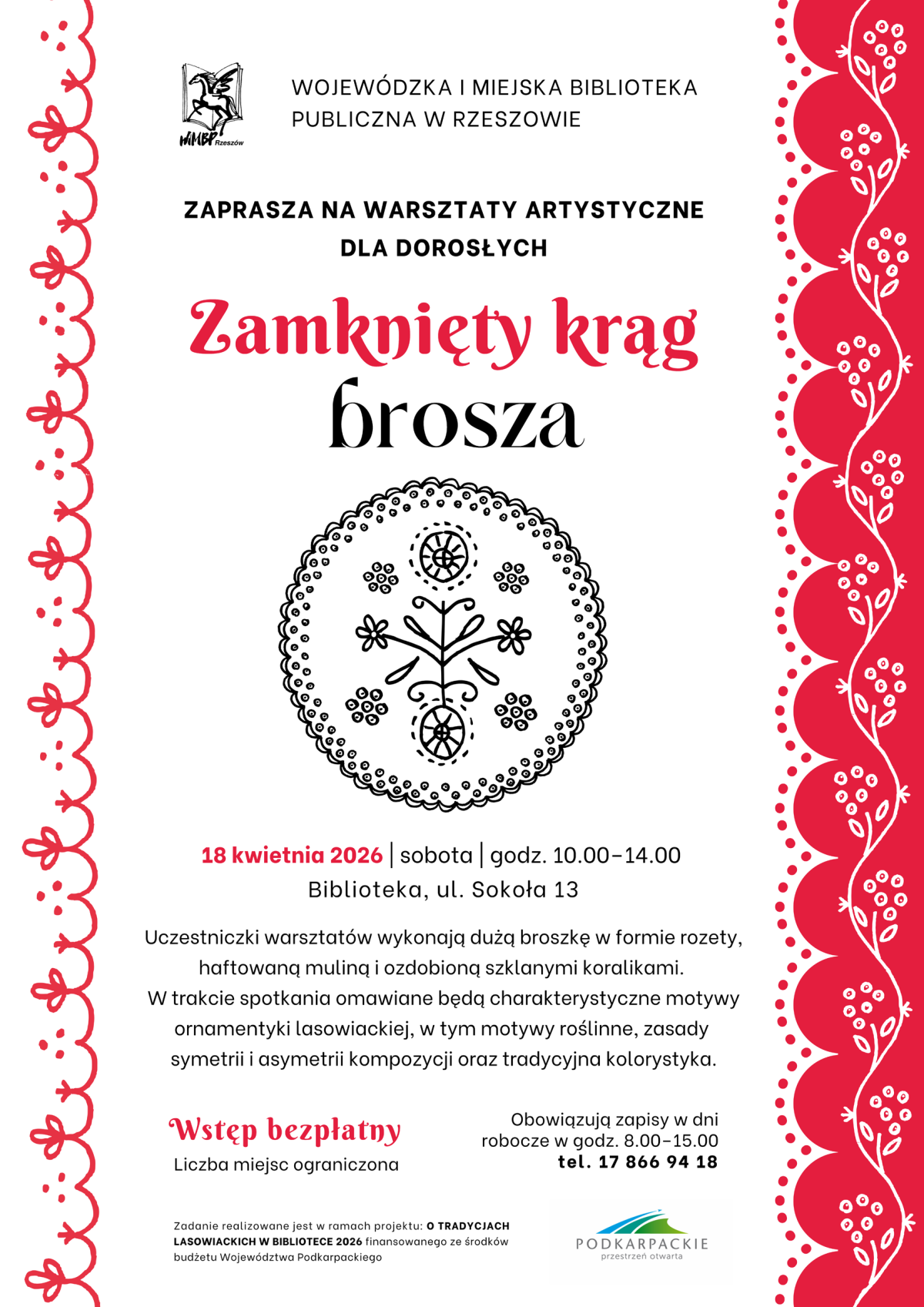 W trakcie spotkania omawiane będą charakterystyczne motywy ornamentyki lasowiackiej, w tym motywy roślinne, zasady symetrii i asymetrii kompozycji oraz tradycyjna kolorystyka.