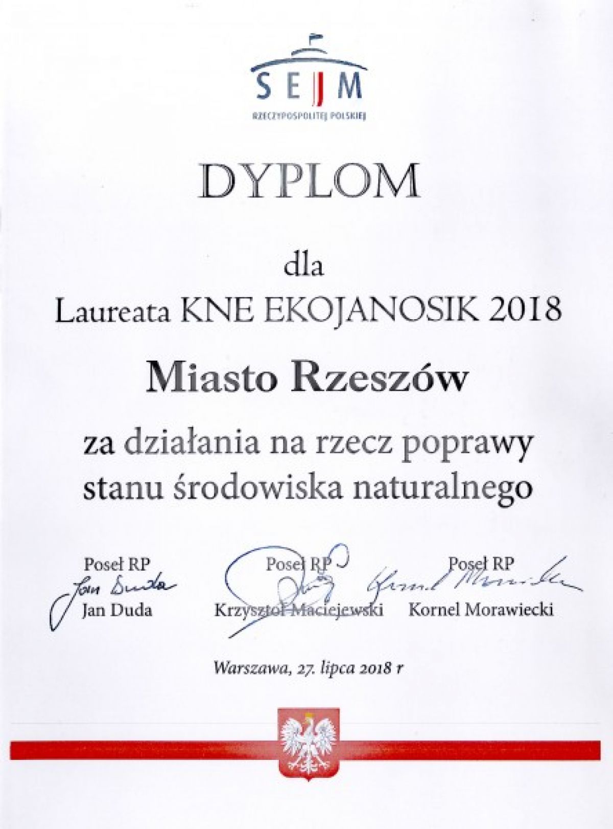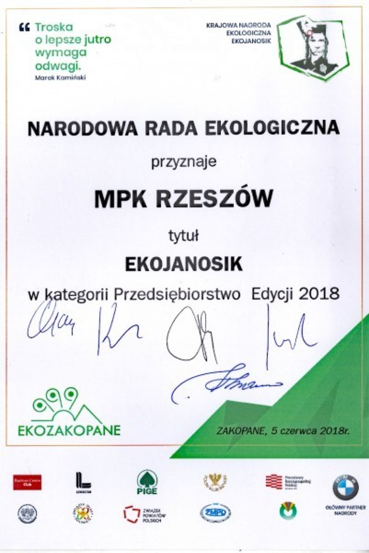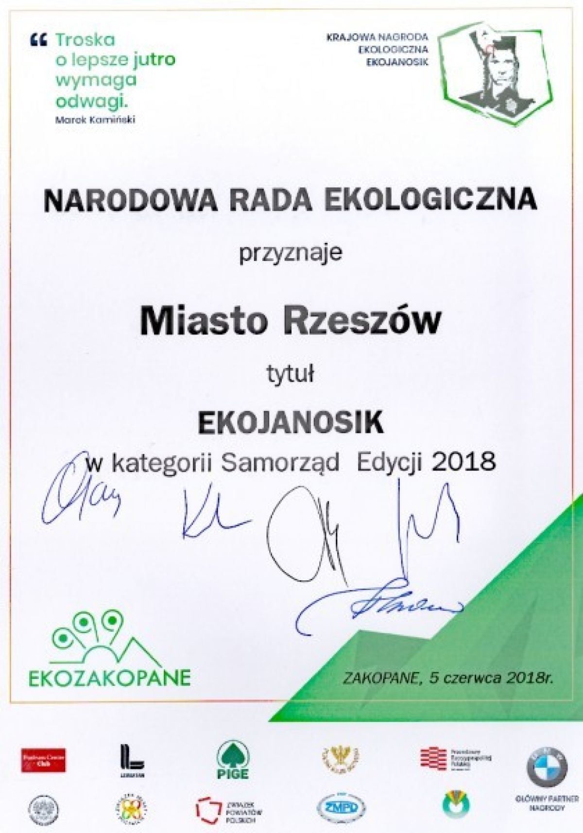 W kategorii „Samorząd” laureatem Krajowej Nagrody Ekologicznej EKOJANOSIK - ZIELONA WSTĘGA POLSKI zostało Miasto Rzeszów (za działania na rzecz poprawy stanu środowiska naturalnego - nagroda przyznana przez Sejm RP), natomiast w kategorii „Firma transportowo-komunikacyjna” spółka Miejskie Przedsiębiorstwo Komunikacyjne Sp. z o.o. w Rzeszowie oraz w kategorii „Producent ciepła/energii” - inna rzeszowska spółka miejska - Miejskie Przedsiębiorstwo Energetyki Cieplnej.