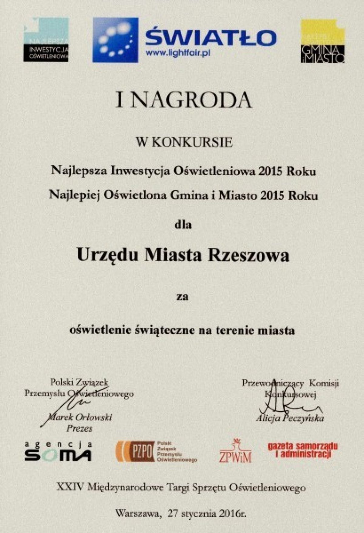 Podczas gali finałowej konkursu „Najlepiej oświetlona gmina i miasto 2015 roku”, „Najlepsza inwestycja oświetleniowa 2015 roku” Urząd Miasta Rzeszowa zdobył I nagrodę za „Oświetlenie świąteczne na terenie miasta” oraz II nagrodę za „Oświetlenie drogi od ul. Załęskiej do ul. Lubelskiej wraz z iluminacją mostu na rzece Wisłok”, realizowane w ramach projektu pn. Poprawa funkcjonowania komunikacji publicznej w centrum Rzeszowa poprzez ograniczenie ruchu tranzytowego i wprowadzenie strefy płatnego parkowania, oraz za oświetlenie węzła drogowego al. Wyzwolenia - ul. Warszawska, realizowane w ramach projektu pn. Budowa systemu integrującego transport publiczny miasta Rzeszowa i okolic, a także za oświetlenie ul. Karola Wojtyły".