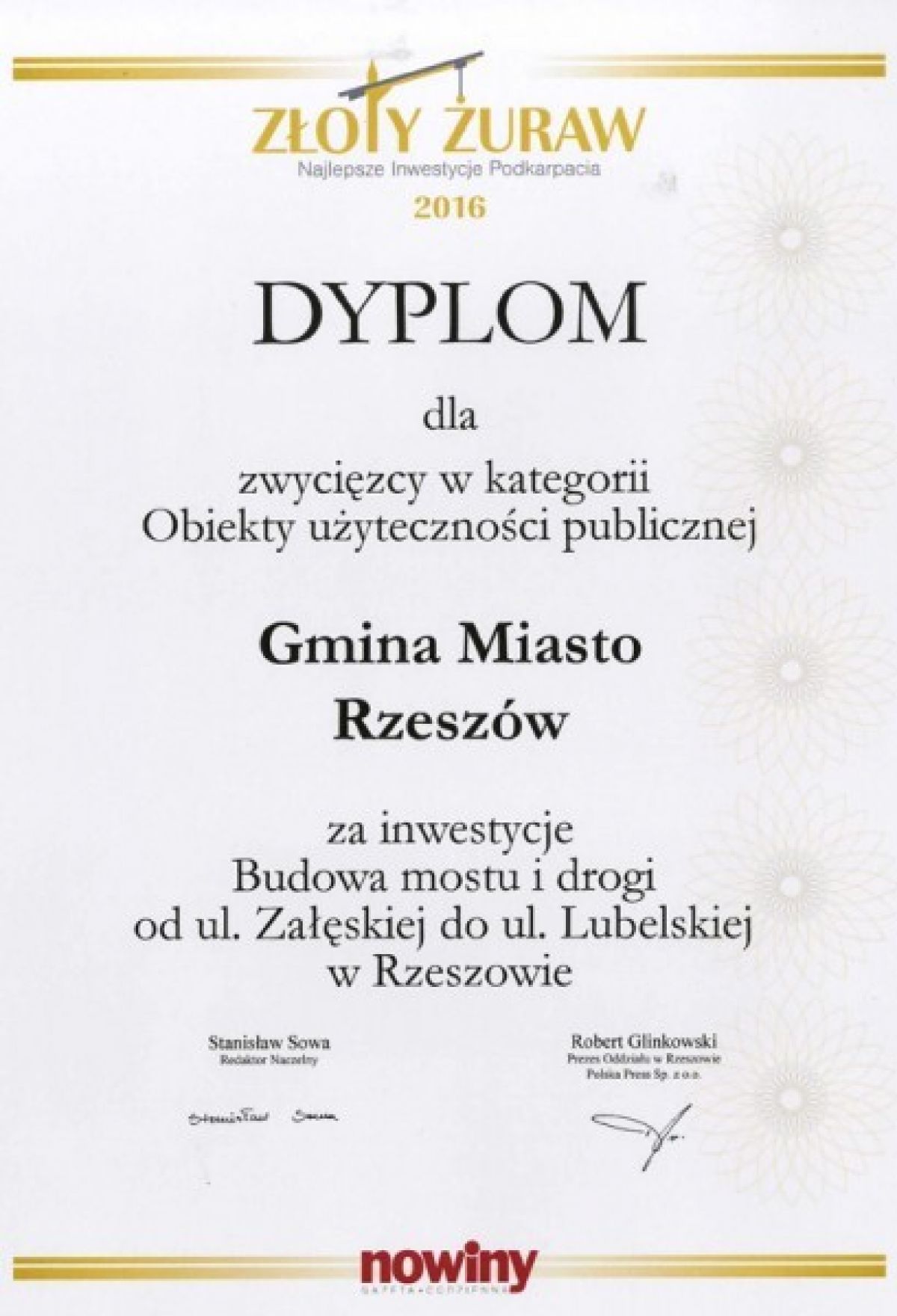 Zwycięzcą w kategorii Obiekty użyteczności publicznej została Gmina Miasto Rzeszów, która za inwestycję BUDOWA DROGI OD UL. ZAŁĘSKIEJ DO UL. LUBELSKIEJ WRAZ Z BUDOWĄ MOSTU IM. TADEUSZA MAZOWIECKIEGO W RZESZOWIE otrzymała nagrodę – statuetkę „Złoty Żuraw”.