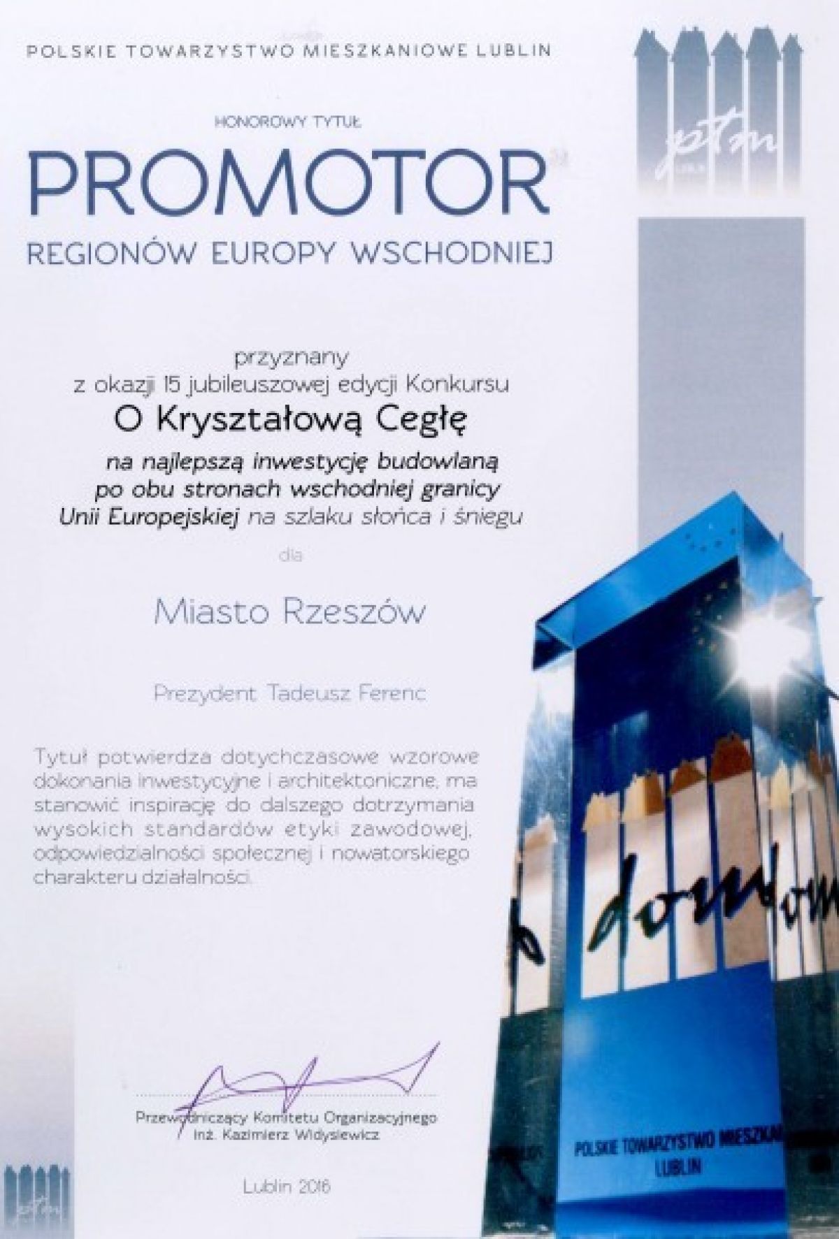 Polskie Towarzystwo Mieszkaniowe z okazji 15 jubileuszowej edycji Konkursu „O Kryształową Cegłę” na najlepszą inwestycję budowlaną po obu stronach wschodniej granicy Unii Europejskiej przyznało dla Miasta Rzeszowa honorowy tytuł PROMOTORA REGIONÓW EUROPY WSCHODNIEJ, potwierdzający dotychczasowe wzorowe dokonania inwestycyjne i architektoniczne.