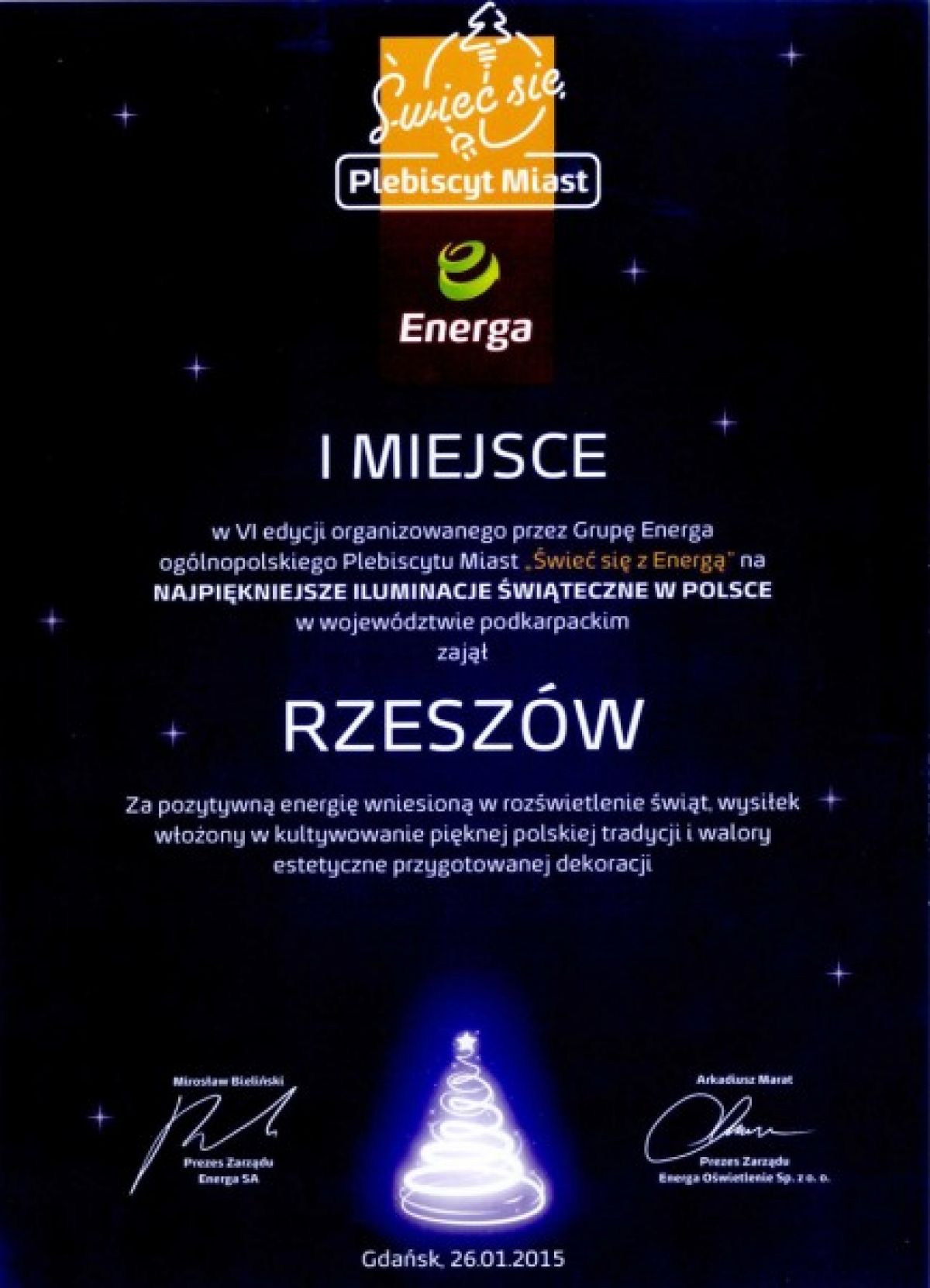 Rzeszów zajął I miejsce w VI edycji organizowanego przez Grupę Energa ogólnopolskiego Plebiscytu Miast „Świeć się z Energą” na NAJPIĘKNIEJSZE ILUMINACJE ŚWIĄTECZNE W POLSCE w województwie podkarpackim.
