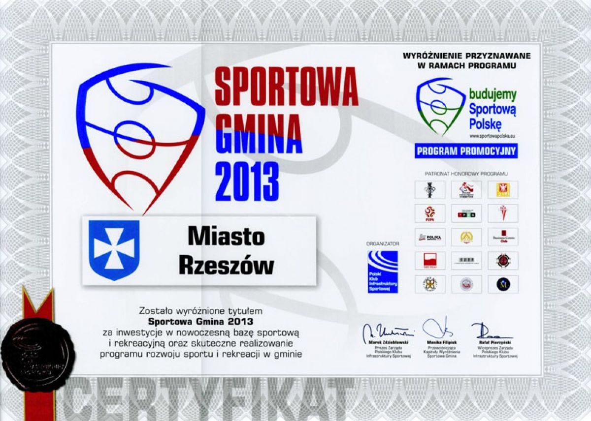 23 maja 2013 r. w Centrum Olimpijskim w Warszawie (siedzibie PKOl) podczas gali sportowej zostały wręczone wyróżnienia "Sportowa Gmina". Miasto Rzeszów zostało wyróżnione tytułem SPORTOWA GMINA 2013 za inwestycje w nowoczesną bazę sportową i rekreacyjną oraz skuteczne realizowanie programu rozwoju sportu i rekreacji w gminie.