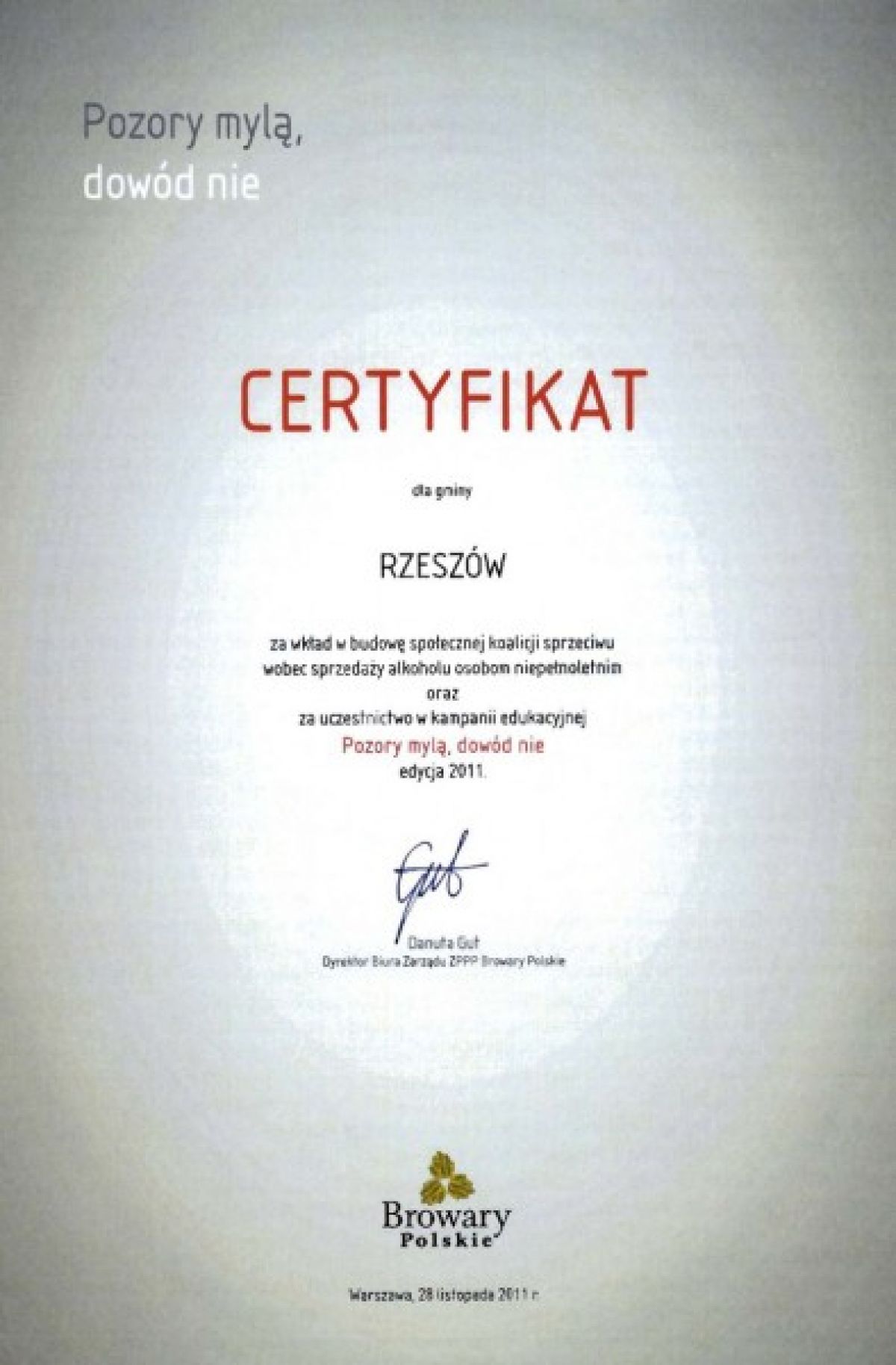 Gmina Miasto Rzeszów otrzymała certyfikat przyznany przez Związek Pracowników Przemysłu Piwowarskiego w Polsce za wkład w budowę społecznej koalicji sprzeciwu wobec sprzedaży alkoholu osobom niepełnoletnim oraz za uczestnictwo w kampanii edukacyjnej „Pozory mylą, dowód nie” edycja 2011.