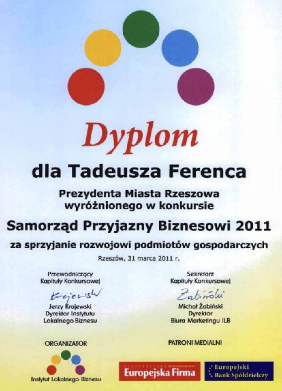 Instytut Lokalnego Biznesu przyznał statuetkę oraz tytuł SAMORZĄD PRZYJAZNY BIZNESOWI 2011 dla Miasta Rzeszowa.