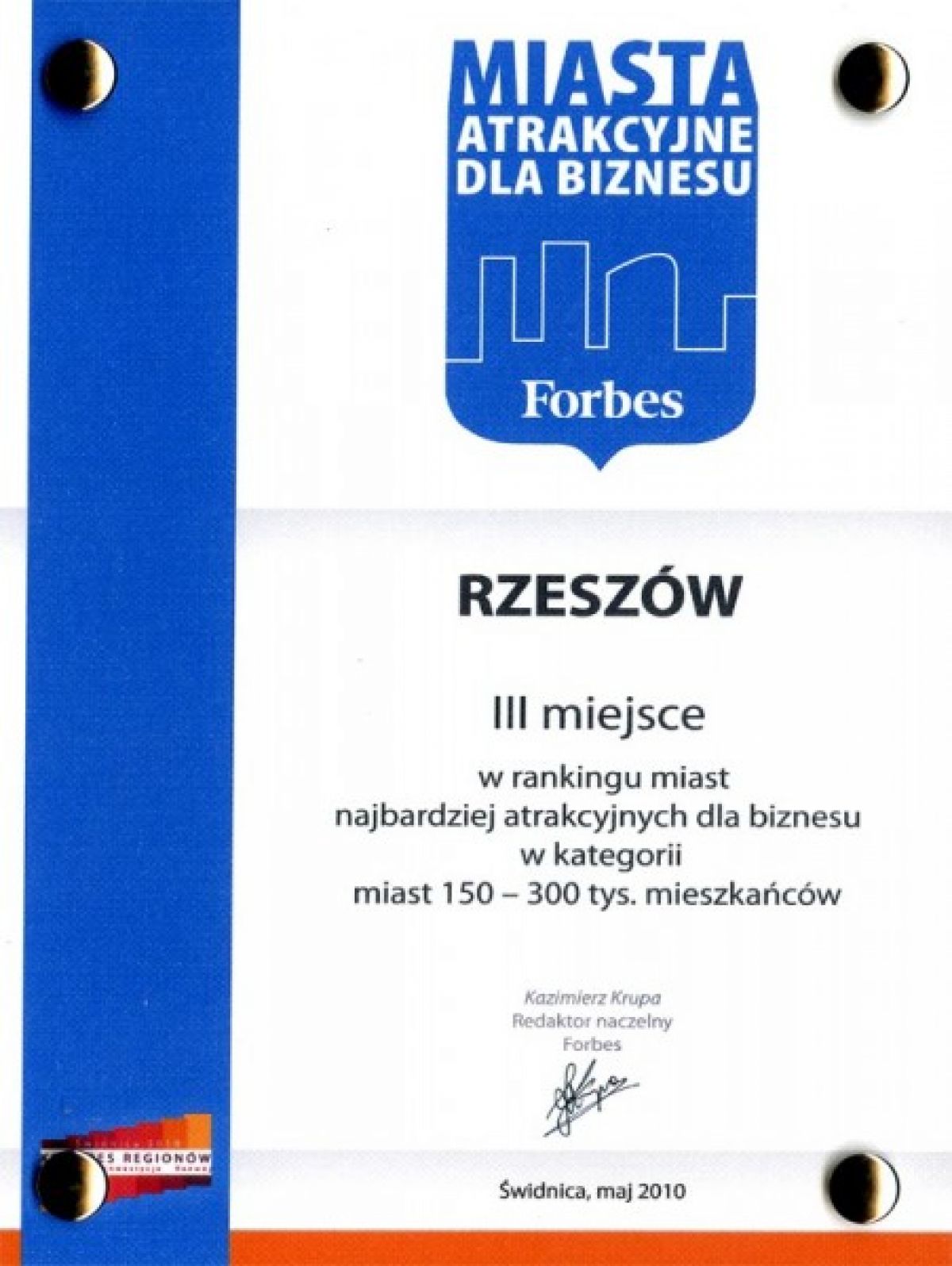 Druga nagroda, przyznana nam została przez miesięcznik Forbes – za zdobycie trzeciego miejsca w rankingu miast najbardziej atrakcyjnych dla biznesu w kategorii od 150 do 300 tys. mieszkańców. Podczas sporządzania rankingu brano pod uwagę dynamikę wzrostu liczby spółek rejestrowanych w 2009 r. w KRS, w porównaniu do roku 2008. W kategorii miast od 150 – 300 tys. mieszkańców, w której znalazł się Rzeszów, najlepiej oceniony został Toruń, poniżej jest Bielsko-Biała. Za pierwszą trójką znalazły się takie miasta jak Opole, Gliwice Olsztyn, Zabrze, Częstochowa, Bytom i Kielce.