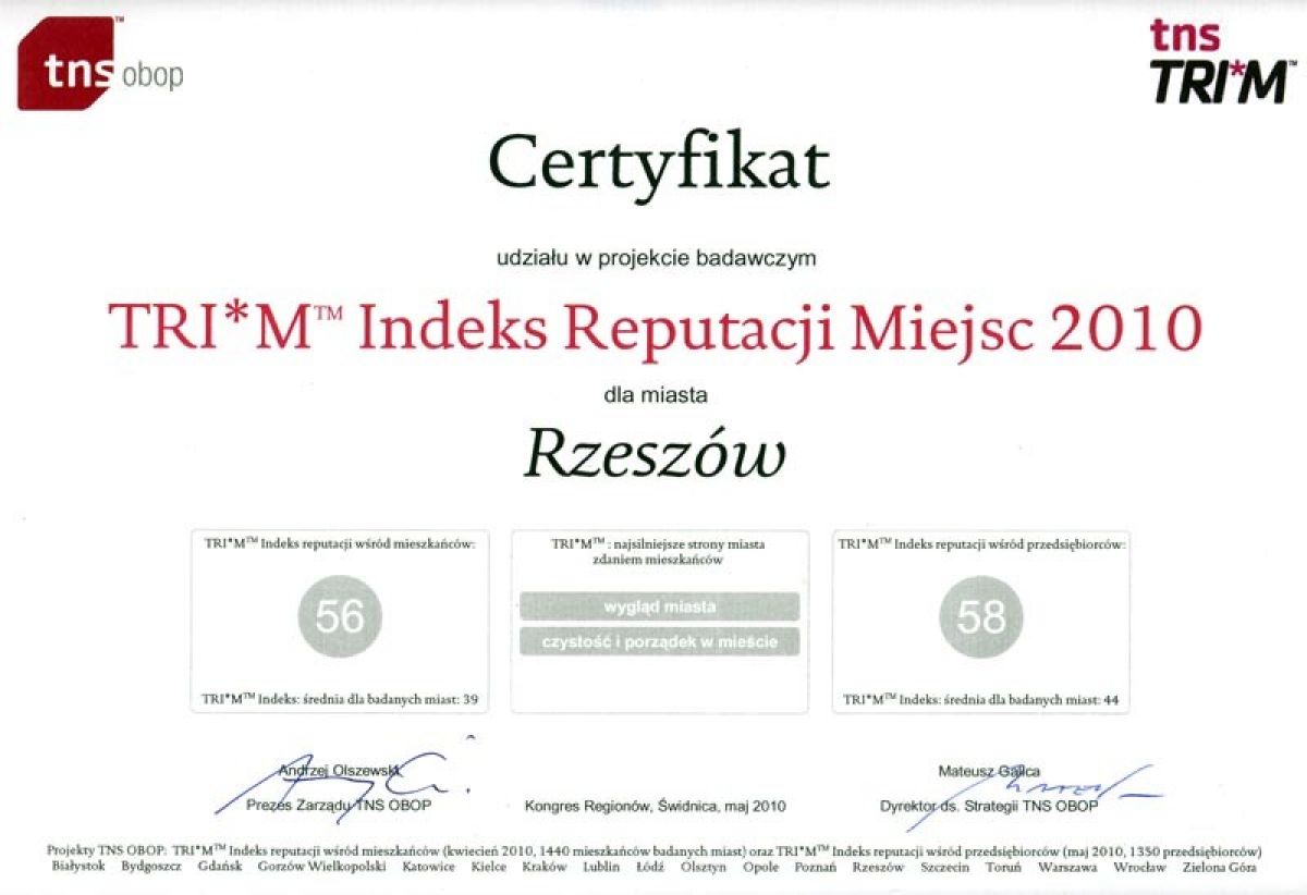 Ponadto otrzymaliśmy certyfikat udziału w projekcie badawczym TRI*M Indeks Reputacji Miejsc 2010. Mieszkańcy i przedsiębiorcy biorący udział w tym badaniu, najwyżej ocenili wygląd a także czystość i porządek w mieście.