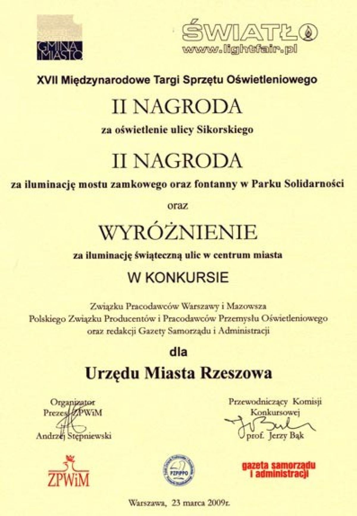 Komisja konkursu „Na najlepiej oświetloną gminę i miasto 2008 roku” w grupie miast i gmin powyżej 70 tys. mieszkańców przyznała Urzędowi Miasta Rzeszowa: