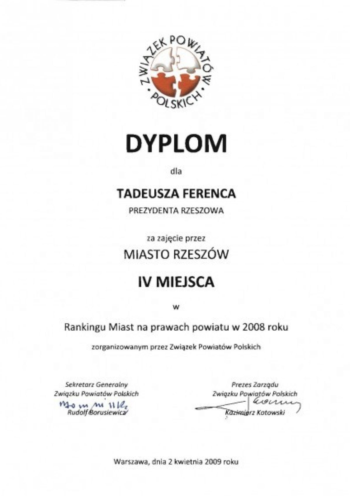 W rankingu za 2008 rok sklasyfikowano 65 miast na prawach powiatu z całej Polski. Rzeszów zdobył bardzo wysokie – czwarte miejsce. Puchar i dyplom odebrał w Warszawie prezydent Rzeszowa Tadeusz Ferenc. – To nie jest nagroda dla mnie, a dla wszystkich mieszkańców, którzy każdego dnia angażują się w działania na rzecz naszego miasta – twierdzi Tadeusz Ferenc.