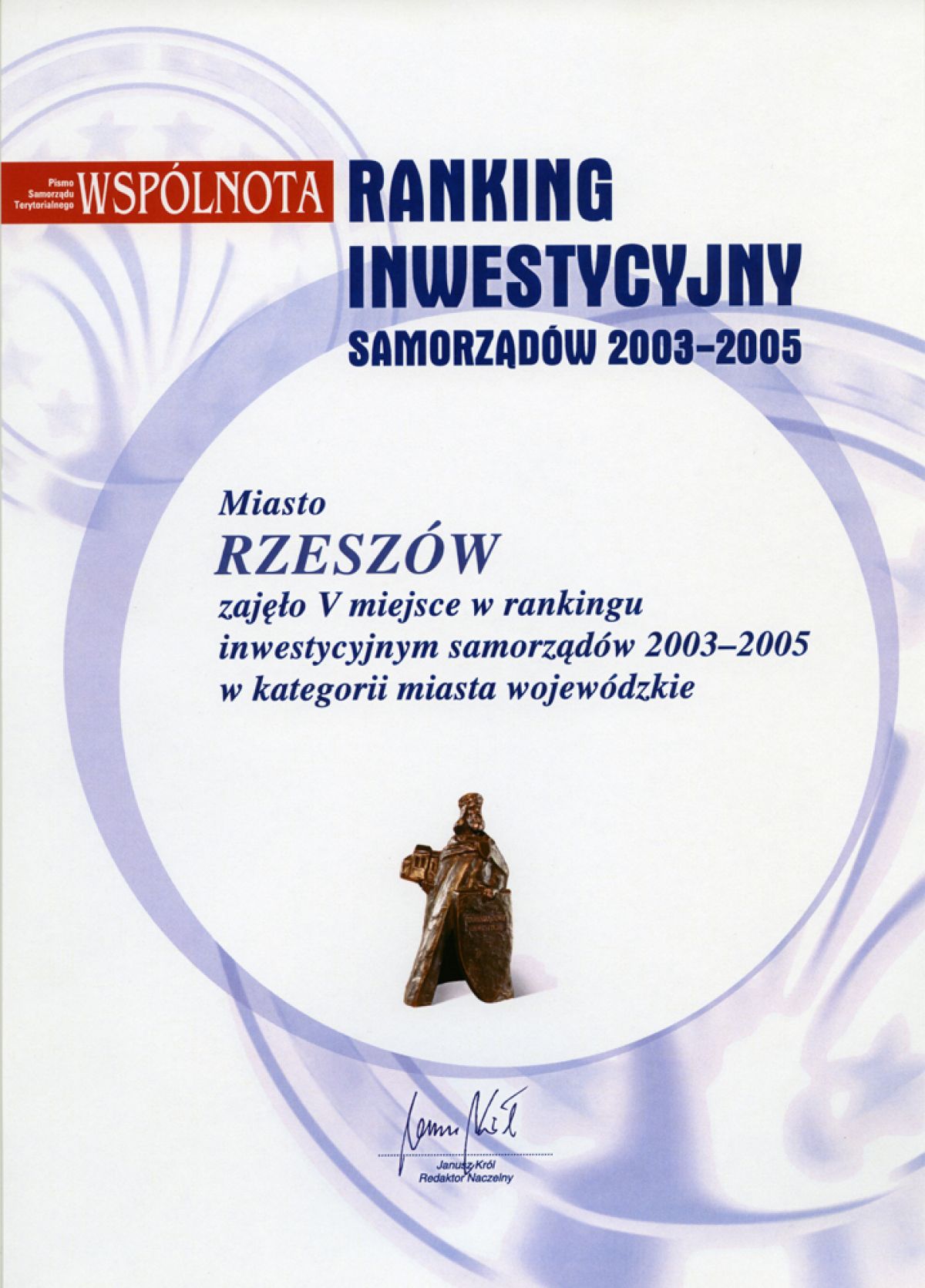 13 października 2006 r. pismo samorządu terytorialnego Wspólnota opublikowało ranking Inwestycje w infrastrukturę techniczną, w którym zestawiono nakłady (w zł) na 1 mieszkańca w poszczególnych miastach w latach 2003-05.