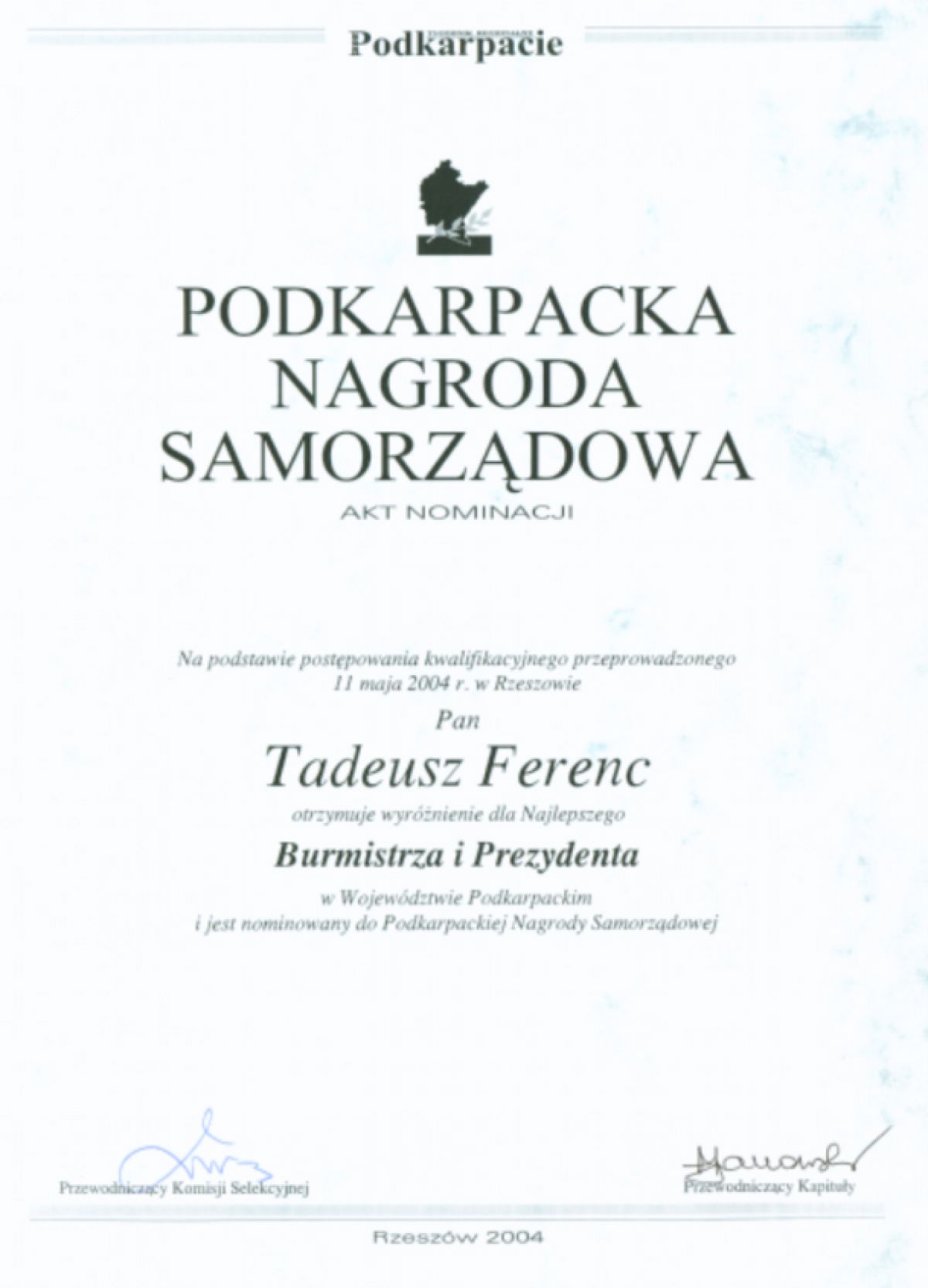 W IV edycji Konkursu PODKARPACKA NAGRODA SAMORZĄDOWA organizowanego przez tygodnik regionalny "Nowe Podkarpacie" i Podkarpackie Stowarzyszenie Samorządów Terytorialnych w Rzeszowie w 2004 roku Prezydent Rzeszowa Tadeusz Ferenc zajął 1 miejsce w kategorii BURMISTRZ - PREZYDENT.