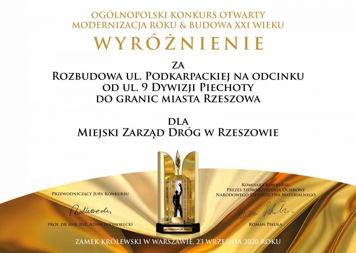 Rzeszów otrzymał wyróżnienie za inwestycję pn. Rozbudowa ul. Podkarpackiej na odcinku od ul. 9 Dywizji Piechoty do granic miasta.